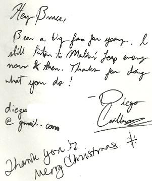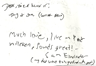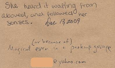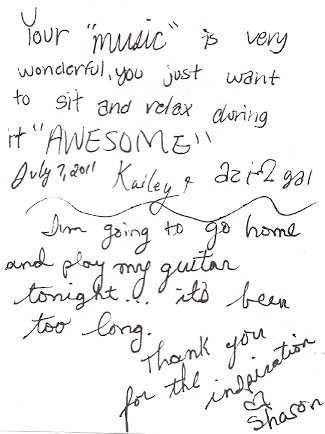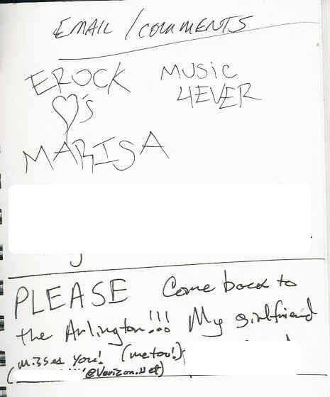 In chronological order, the Bruce Goldish GUEST BOOK - nesting strategically next to the Donation Receptacle at live shows, beginning early 2005. Many of these "shows" took place in "Bruce's Favorite Outlaw Places in the World to Play," for instance, late night in the parking structure (see video) in downtown Santa Barbara. Pages are in original order. It's a humungous web page, as zero comments are edited out, only contact info.
